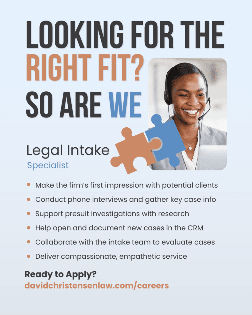 If you’re a legal assistant looking to take the next step in your career, we want to hear from you. Send your resume and a cover letter outlining your relevant experience to careers@davidchristensenlaw.com.